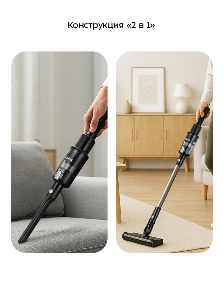 Конструкция «2 в 1» предусматривает наличие ручного пылесоса, который удобно использовать.