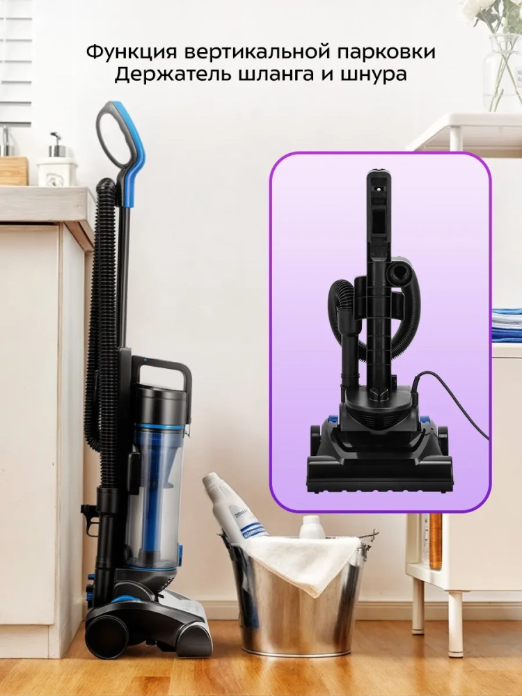 Благодаря функции вертикальной парковки пылесос занимает мало места при хранении, а во время работы может легко вписаться в узкий коридор или комнату, заполненную различными предметами. На устройстве предусмотрены специальные держатели для хранения шланга и шнура питания, а также держатель для насадки.