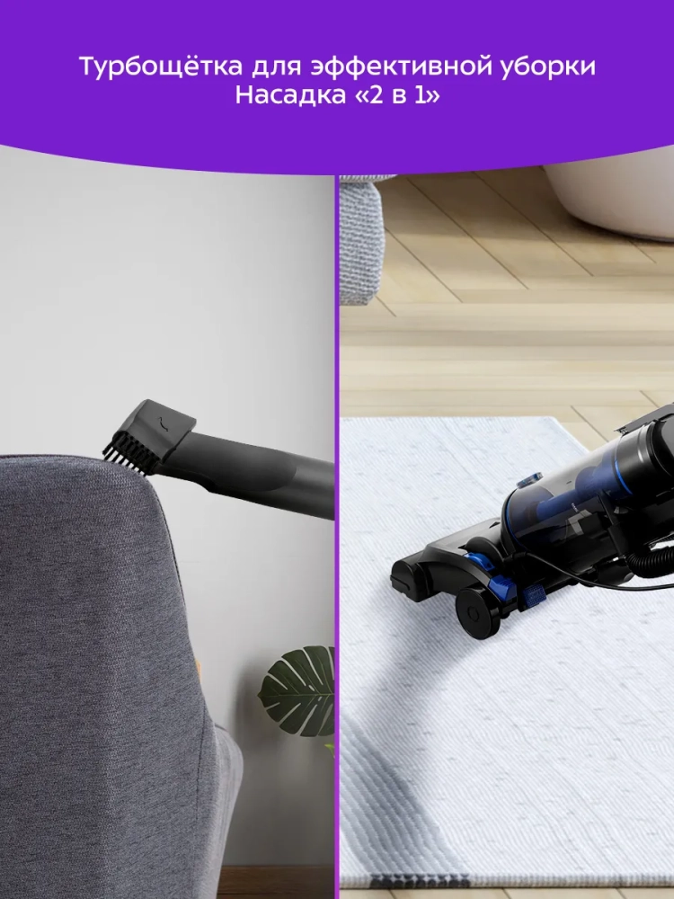 В комплекте есть насадка «2 в 1», которая поможет вычистить щели, углы, плинтусы и другие узкие места в квартире, обивку мягкой мебели, и может использоваться для сбора мелкого сыпучего мусора с неровных поверхностей. Также к пылесосу прилагается удлинительная трубка с ручкой.