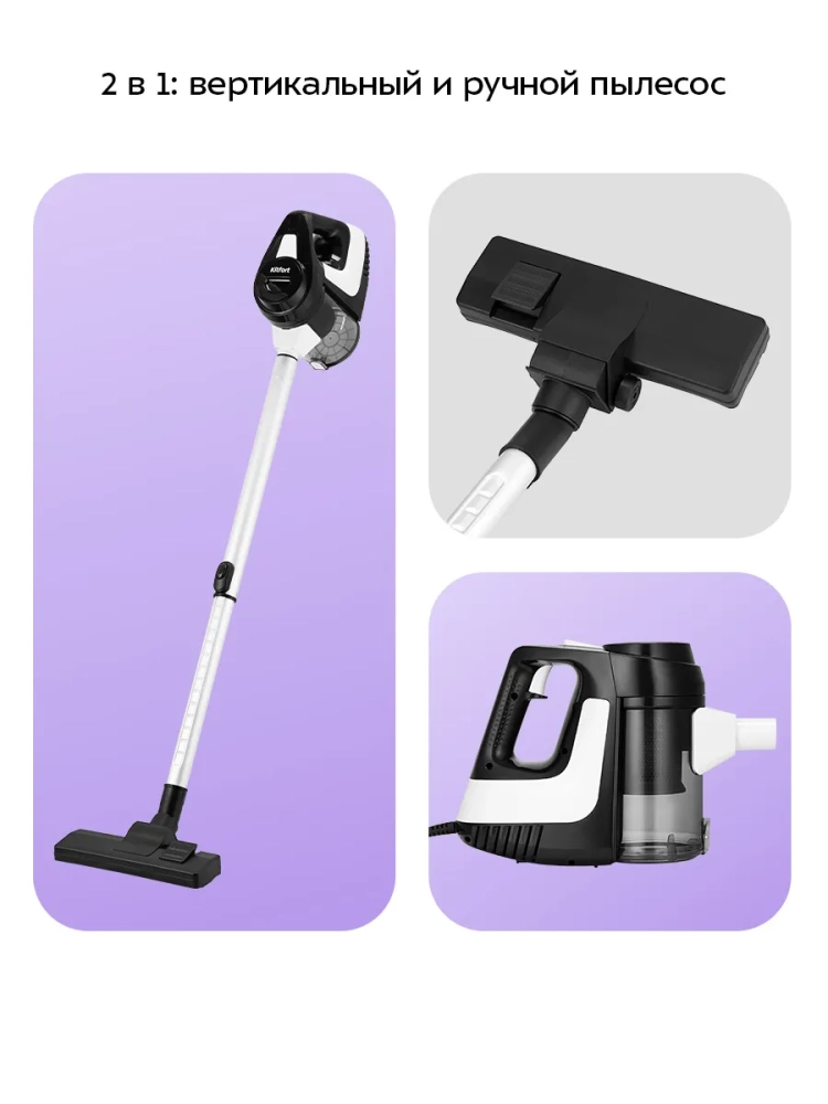 Конструкция «2 в 1» предусматривает наличие ручного пылесоса, который удобно использовать отдельно. Ручным пылесосом можно пропылесосить углы и плинтусы, обивку мебели, пыль со шкафов (куда обычным пылесосом очень трудно дотянуться из-за ограниченной длины шланга), шкафчики на кухне или в гостиной, книжные полки, коврики в автомобиле или багажник.
