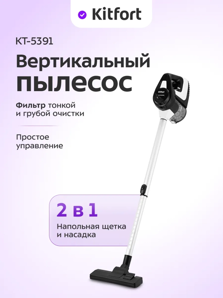 Вертикальный пылесос Kitfort КТ-5391 очень удобен при локальной уборке. Он компактен, всегда под рукой и готов к работе. При отсоединении удлинительной трубки и установке насадки он превращается в ручной пылесос. Его конструкция позволяет легко проникать в самые труднодоступные уголки квартиры. При этом не нужно передвигать громоздкий корпус прибора и управляться с непослушным шлангом. Пылесос оснащен маневренной напольной щеткой, которая вращается в двух плоскостях.