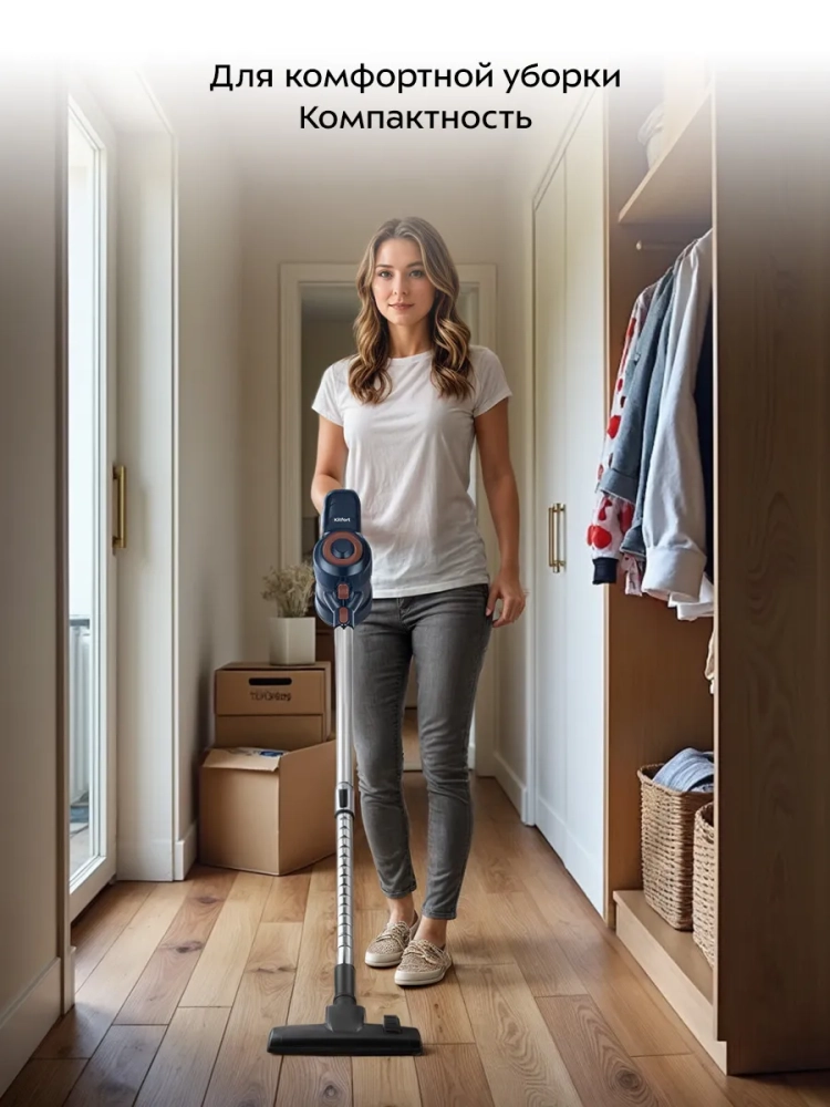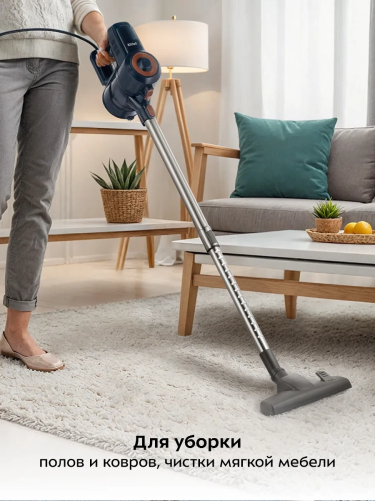 Вертикальный пылесос для дома Kitfort КТ-5531 — это незаменимый помощник в быту, который обеспечит качественную сухую уборку вашего дома. Этот мощный и компактный бытовой прибор идеально подходит как для локальной, так и для генеральной уборки. Благодаря своей конструкции, он легко трансформируется в ручной пылесос, что позволяет эффективно очищать мебель и труднодоступные места. Проводной вертикальный пылесос Kitfort оснащен маневренной напольной щеткой, которая обеспечивает тщательную чистку пола от пыли и грязи. Пылесос удобен в использовании благодаря своей легкости и компактности. Он станет отличным решением для небольших квартир, где важно экономить пространство: его можно хранить на стене с помощью кронштейна из комплекта. Конструкция "2 в 1" позволяет использовать его как ручной пылесос не только для дома, но и салона автомобиля. Съемный контейнер-пылесборник техники оснащен современным циклонным фильтром, который гарантирует высокую степень очистки воздуха от частиц грязи. Контейнер легко открывается для быстрого удаления мусора без лишних хлопот. В комплект входят различные насадки: щелевая насадка для узких мест, ворсовая насадка для мебели и ковров и переходник для подключения удлинительной трубки к основному блоку устройства. Это делает вертикальный пылесос Kitfort универсальным инструментом не только для дома. Мощность 600 Вт обеспечивает эффективную работу даже на ковровых покрытиях с коротким ворсом или гладких поверхностях пола. Проводная конструкция гарантирует стабильную производительность без необходимости подзарядки аккумулятора.
