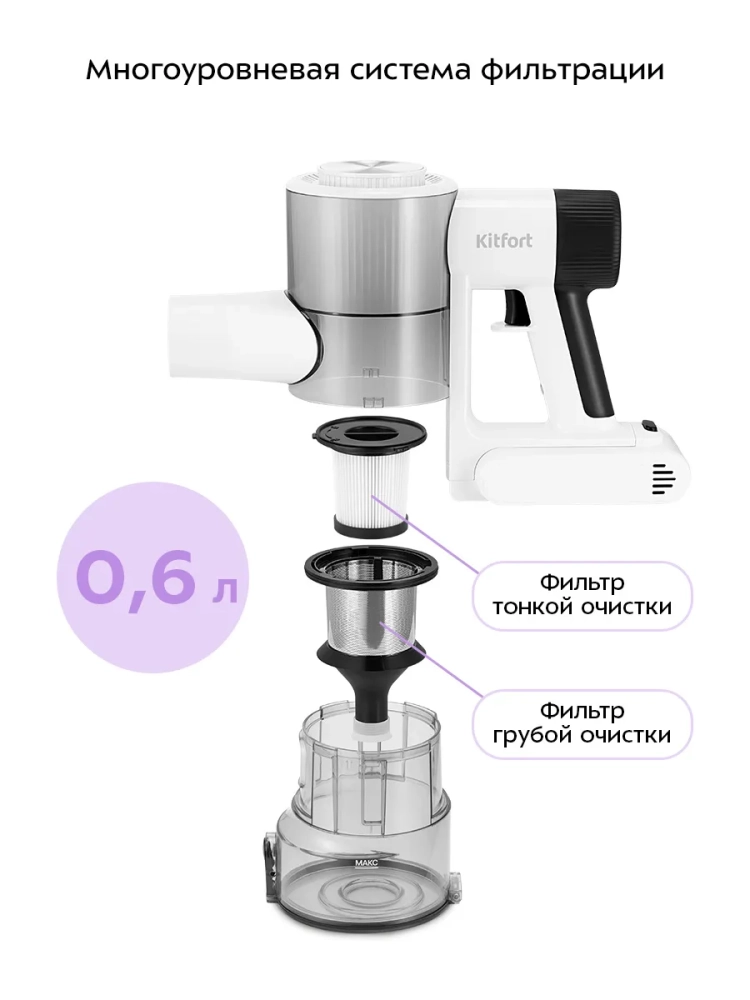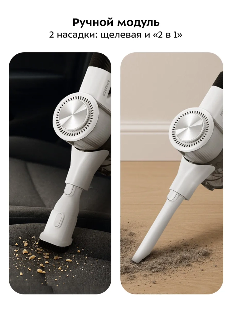 Беспроводной вертикальный пылесос Kitfort КТ-5548 очень удобен при локальной уборке. Он компактен, всегда под рукой и готов к работе. При отсоединении удлинительной трубки и установке насадки он превращается в ручной пылесос. Его конструкция позволяет легко проникать в самые труднодоступные уголки квартиры. При этом не нужно передвигать громоздкий корпус проводного пылесоса и управляться с непослушным шлангом. Благодаря работе от аккумулятора не нужно включать вилку в розетку, провода не мешают под ногами. Поэтому пылесос имеет неограниченный радиус действия: от любого уголка квартиры до машины или беседки в саду. Пылесос оснащен маневренной напольной турбощеткой, которая вращается в двух плоскостях. Гибкая удлинительная трубка позволяет убираться в труднодоступных местах, например под диваном.