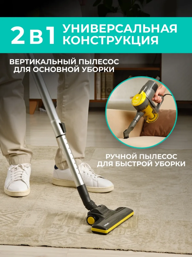 Вертикальный проводной пылесос 2 в 1 - отличное решение для эффективной уборки напольного покрытия, ковра и мебели. Прибор имеет длинный шнур 7 метров, который позволит добраться до любой точки ваше квартиры.
