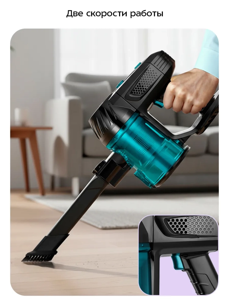 Пылесос работает от аккумулятора, что обеспечивает неограниченный радиус действия: от любого уголка квартиры до машины или беседки в саду. Аккумулятор является съемным, что делает процесс зарядки удобным (не нужно искать розетку, рядом с которой поместится пылесос), а также обеспечивает более безопасную транспортировку пылесоса.