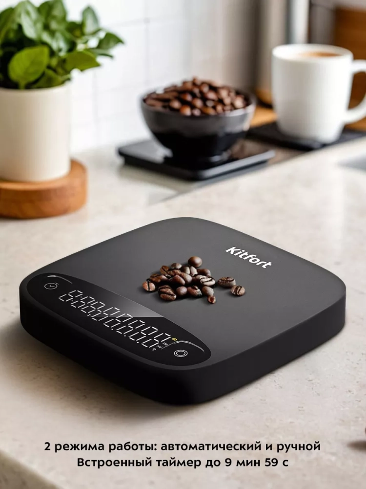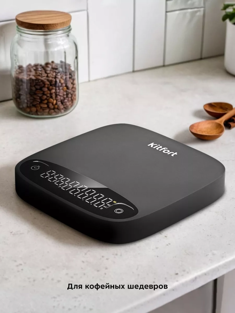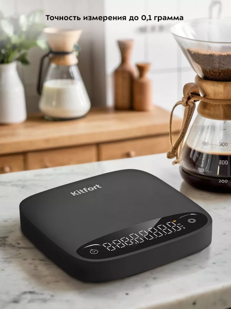 Электронные весы для кофе Kitfort КТ-840 обеспечивают высокую точность измерений и станут незаменимым помощником при приготовлении кофе. Некоторые способы приготовления данного напитка требуют тщательных измерений на протяжении всего процесса приготовления. Прежде всего, это приготовление кофе в кемексе и пуровере, однако полезным будет это устройство и при использовании рожковой кофеварки, а также для помола кофейных зерен.