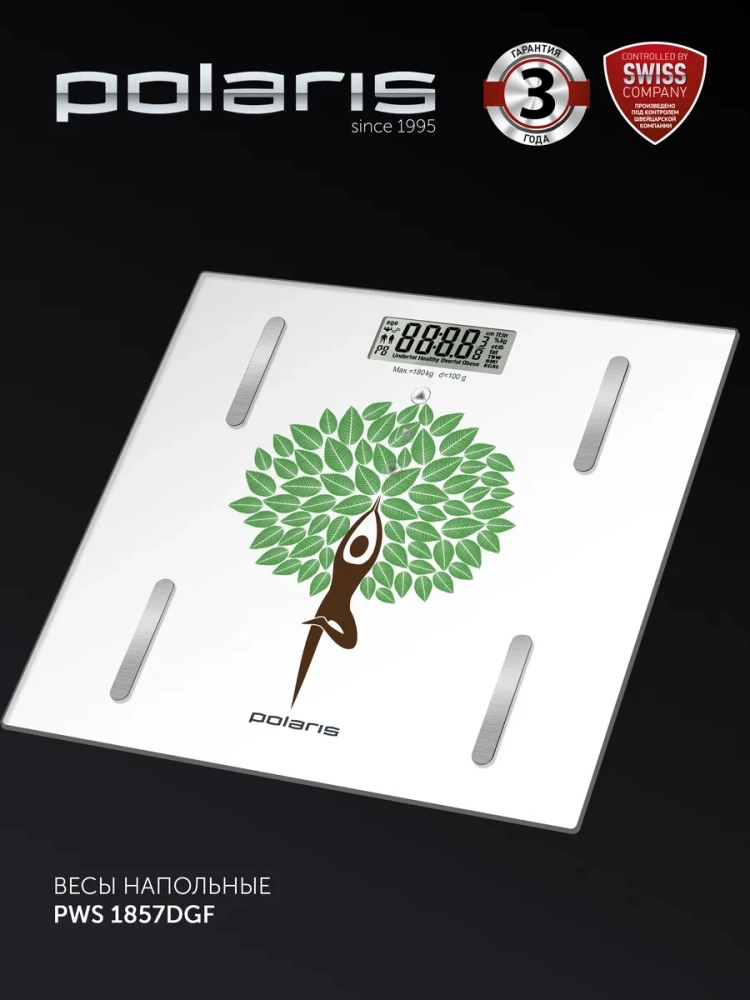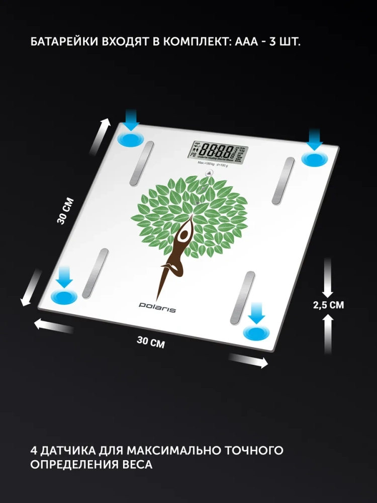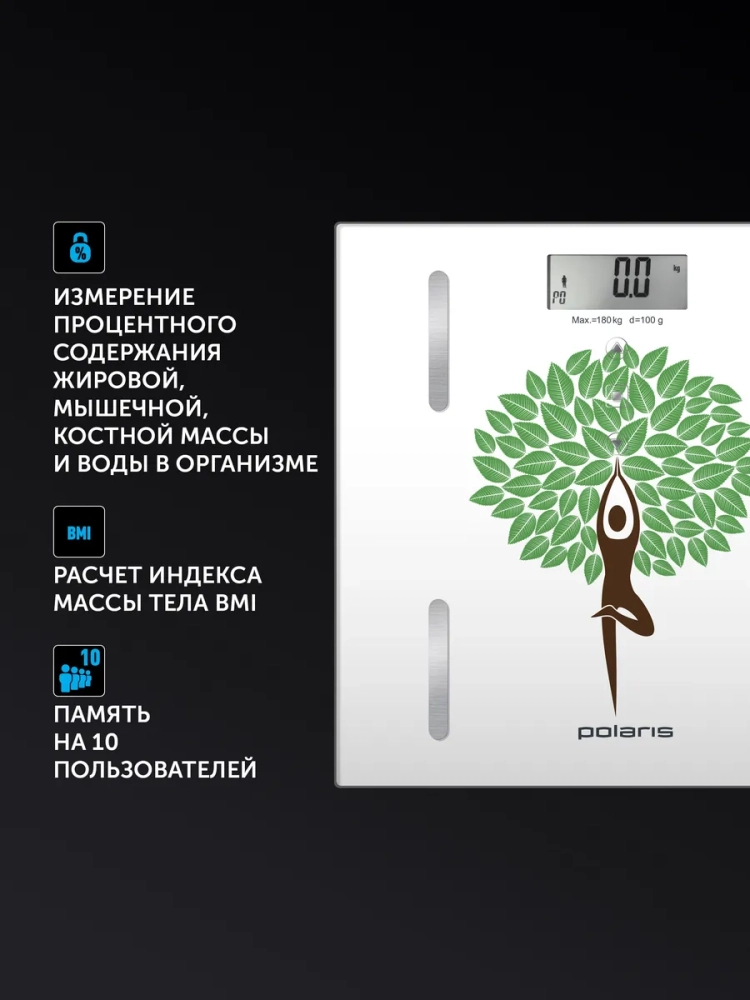 Измерение процентного содержания жировой, мышечной, костной массы и воды в организме. Расчет индекса BMI. Объем памяти на 10 пользователей. Сенсорная система для максимально точного измерения веса. Калькулятор дневной нормы потребления калорий. Большой многофункциональный ЖК-дисплей. Автоматическое включение и отключение.Индикация работы батареек. Индикация превышения максимального веса. Питание: 3 х 1.5V ААА батареи (в комплекте).