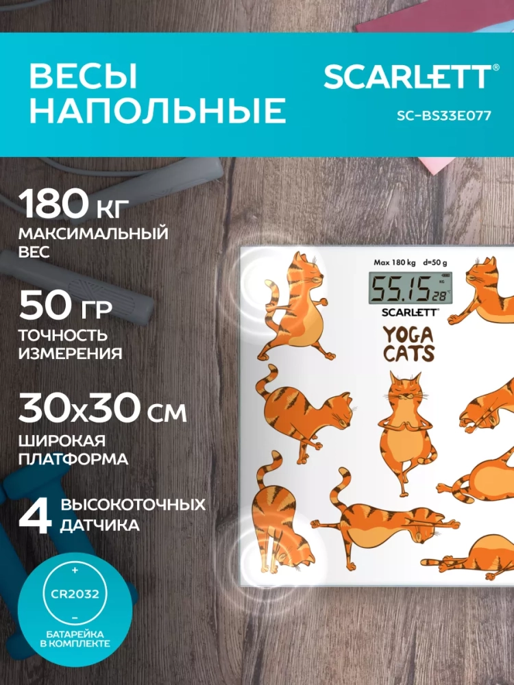 Напольные весы Scarlett - это простой и удобный способ контролировать свой вес! Благодаря высокочувствительным датчикам погрешность составит не более одной цены деления: 100 г. Максимальный вес: 180 кг. Ультратонкий дизайн обеспечит компактное хранение. Материал платформы - высокопрочное закаленное стекло. Автоматическое включение и выключение позаботятся об экономом расходе заряда батареи. Индикатор перегрузки и индикатор батарейки обеспечат комфортную эксплуатацию. Большой жидкокристаллический дисплей 74 x 30 мм делает эксплуатацию весов комфортнее. Прорезиненные ножки придают дополнительной устойчивости и предотвращают скольжение. А приятное цветовое решение и яркая композиция позволят прибору не только вписаться в любой интерьер, но и радовать глаз каждый день!
