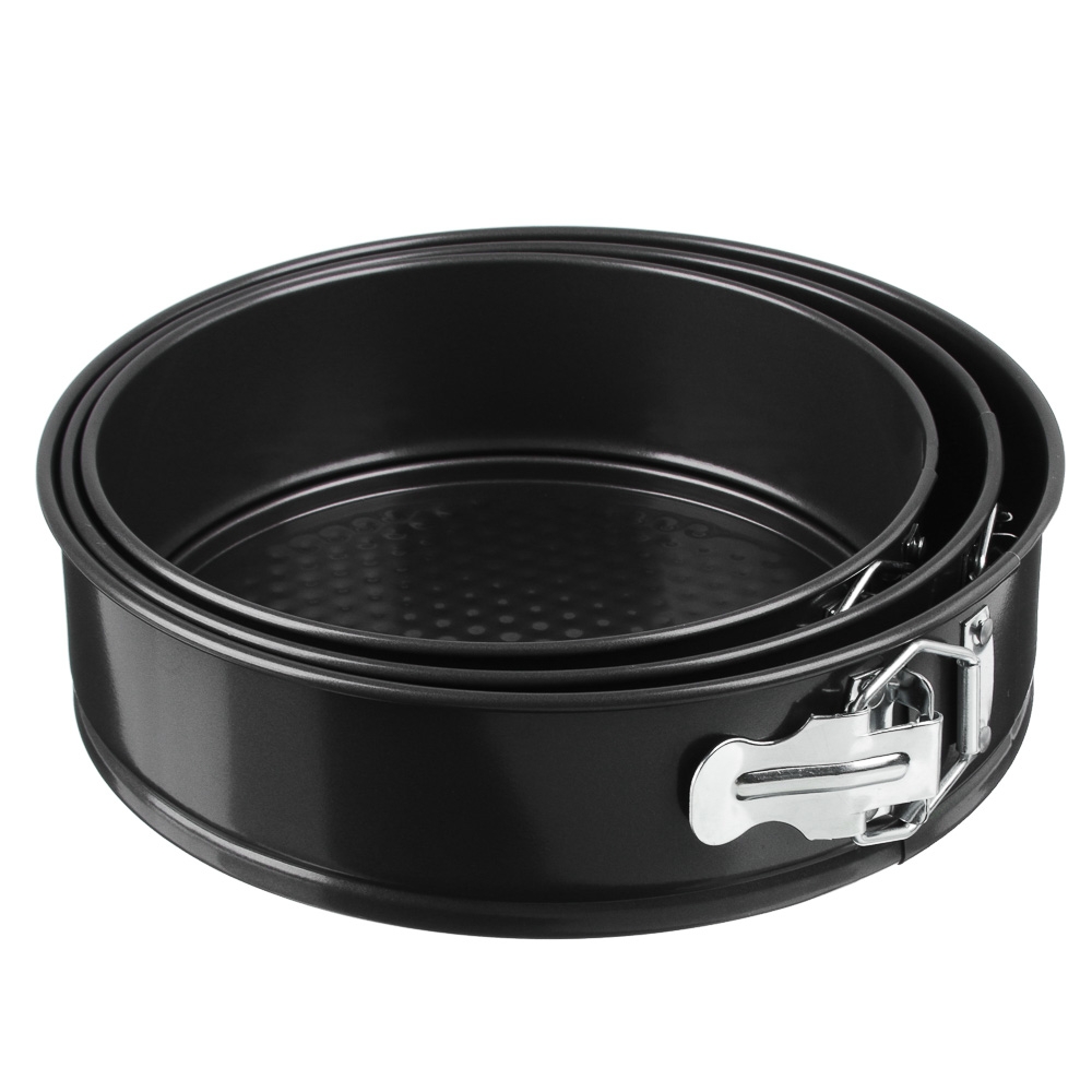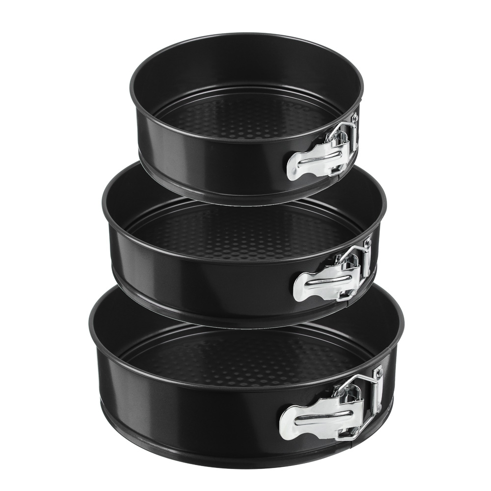Набор из 3 разъемных форм для выпечки различного диаметра - 20см, 22см, 24см, с высотой бортика 6,5 см, изготовлены из углеродистой стали с 2-х слойным антипригарным покрытием изнутри и снаружи и предназначены для использования в духовых шкафах.