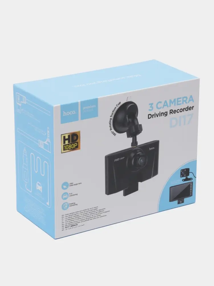Видеорегистратор с тремя камерами HOCO DI17 для безопасного движения на дороге и комфортной парковки. Большой и яркий дисплей, диагональю 4 дюйма с высоким разрешением, позволяет просматривать видео в отличном качестве. Объектив основной камеры имеет широкий угол обзора 140 градусов, что позволяет покрыть несколько полос движения и обочину. Дополнительная камера вращается на 360 градусов, что дает возможность вести панорамную съемку. Камера заднего вида имеет встроенный кабель длиной 48 см. и подключается к основной камере через кабель длиной 6 метров. Её можно прикрепить к верхней части заднего стекла автомобиля или на номерной знак (есть функция включения при движении задним ходом). Также в камере расположены ИК сенсоры для ночной съемки. Встроенная камера записывает видео высокой четкости с разрешением 1080Р. Формат видео AVI, формат фото JPG. Запись происходит на высокоскоростную карту памяти MicroSD от 4 до 32 GB Сlass 10 и выше (в комплект не входит, можно приобрести отдельно, Арт. 145521338 ). Запись видео на карту памяти циклическая, т.е. если память карты будет заполнена, то ранее записанное видео будет удаляться автоматически. Однако видео, записанное в результате срабатывания G сенсора сохранится автоматически. G сенсор реагирует на резкие изменения в скорости движения автомобиля. Также спасти видео от автоматического удаления можно нажав кнопку "M" при включении записи. Автомобильный видеорегистратор реагирует на события, происходящие у автомобиля, даже когда авто стоит на месте, запись включается автоматически и отснятый фрагмент сохранится на карту памяти. Благодаря инфракрасной камере все будет видно даже ночью. Видеорегистратор автомобильный 3 в 1 подключается для питания в прикуриватель специальным кабелем (в комплекте). Определенное время для коротких записей, авторегистратор автомобильный с камерой, может работать и на вмонтированной батарее емкостью 150 мАч. Регистратор в автомобиль с камерой надежно фиксируется на лобовое стекло при помощи крепления с присоской. Меню видеорегистратора с камерой заднего вида и инструкция на русском языке. Видеорегистраторы автомобильные отличный подарок на 23 февраля коллегам, любимому, мужчине, папе. Подарки на 23 февраля прикольные начальнику, коллеге, мужу, другу, сыну. Автомобильные товары можно использовать как подарок в автомобиль для автомобилиста или подарок на машину. Видео регистратор для автомобилей лучший выбор для таксистов и коммерческих автомобилей. По качеству сопоставим с видеорегистратор xiaomi.