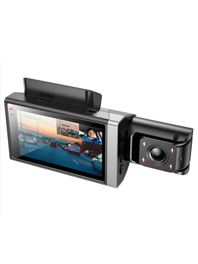 - Количество камер: главная, передняя и внутренняя. Главная камера обеспечивает чёткую запись в высоком качестве, передняя — фиксирует дорогу, внутренняя — следит за происходящим в салоне.