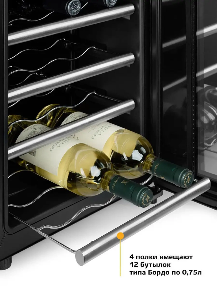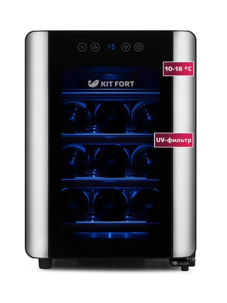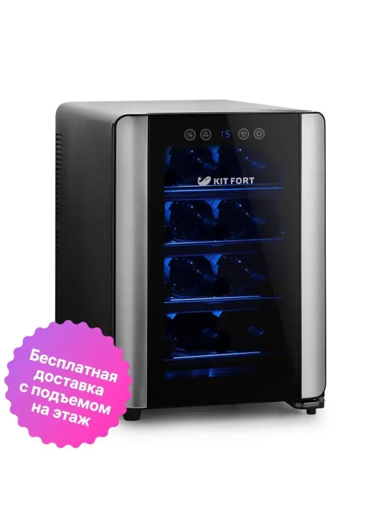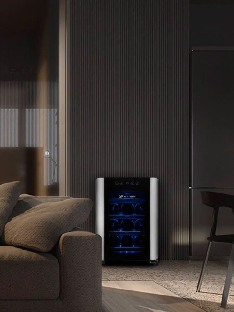 Винный шкаф Kitfort КТ-2402 — это специальная холодильная камера, в которой можно установить подходящую для хранения вина температуру. В винном шкафу четыре полки, на каждой полке помещается по три бутылки. Дверца шкафа прозрачная, в ее верхней части расположена сенсорная панель управления со светодиодным дисплеем. Охлаждение производится при помощи термоэлементов Пельтье, поэтому в конструкции винного шкафа не используются хладагенты и компрессор, из-за чего уровень шума и вибрации при работе значительно ниже, чем у холодильников.
