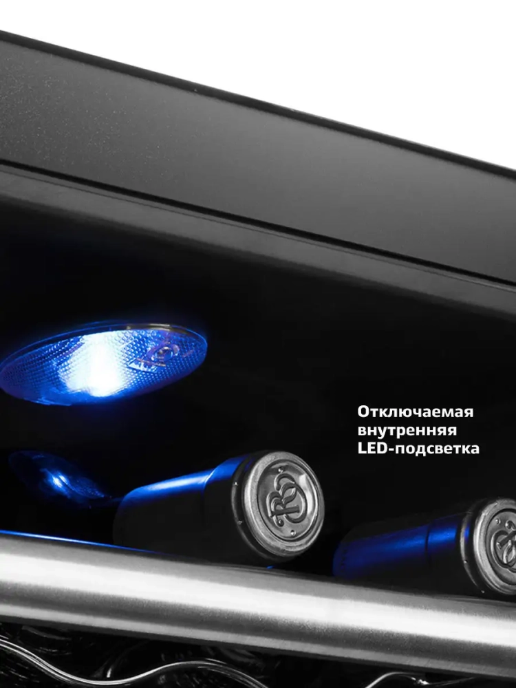 Известно, что вино портится от светового излучения и излучения в ультрафиолетовом диапазоне (прямые солнечные лучи, некоторые виды светильников), поэтому винные бутылки изготавливают из темного стекла. В прозрачных бутылках допустимо выпускать только молодое белое вино; подразумевается, что его быстро выпьют, и оно не будет долго храниться. Дверца винного шкафа также выполнена из темного стекла, оно поглощает видимый свет и ультрафиолетовое излучение. Лампа подсветки светит неярким синим светом, чтобы исключить его воздействие на бутылки с вином. Так что в винном шкафу вы можете хранить вино даже в прозрачных бутылках — там оно будет не только храниться при нужной температуре, но и будет защищено от света. Разумеется, в винном шкафу можно хранить не только вино, но также пиво и другие напитки, в том числе безалкогольные.