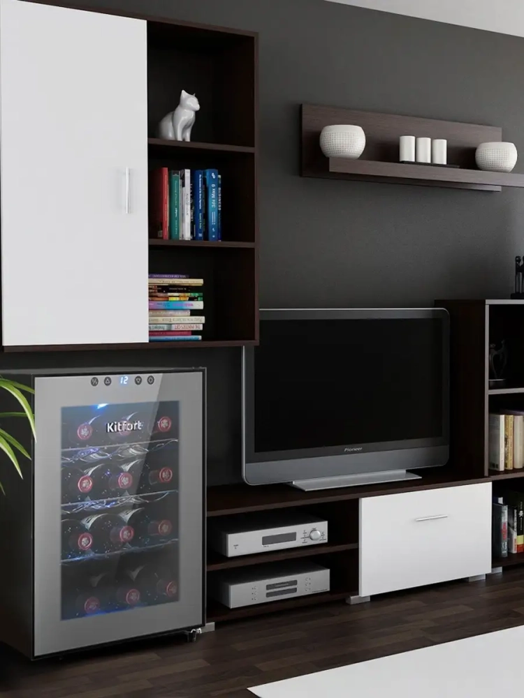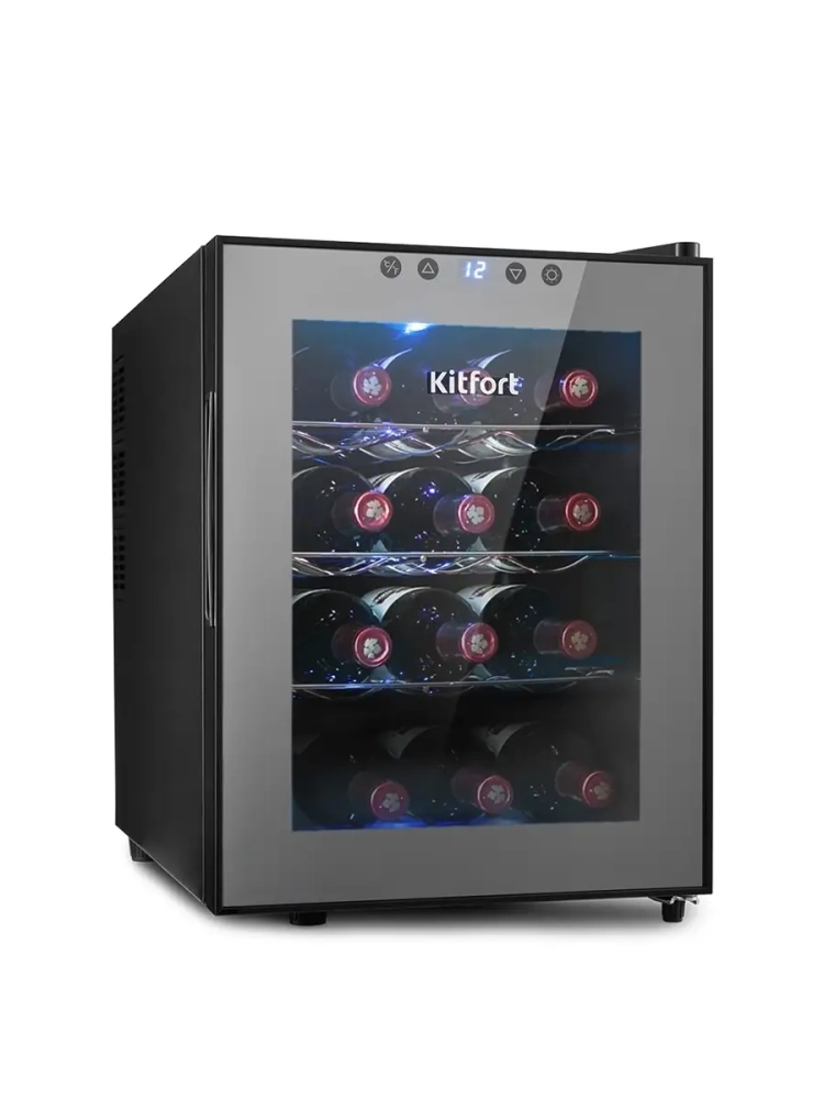 Винный шкаф Kitfort КТ-2408 — это специальная холодильная камера, в которой можно установить подходящую для хранения вина температуру. В винном шкафу четыре полки, на каждой полке помещается по три бутылки. Дверцы шкафа прозрачные, в верхней части расположена сенсорная панель управления со светодиодным дисплеем. Охлаждение производится при помощи термоэлементов Пельтье, поэтому в конструкции винного шкафа не используются хладагенты и компрессор, из-за чего уровень шума и вибрации при работе значительно ниже, чем у холодильников.