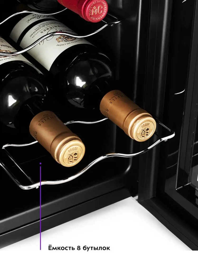 В винном шкафу КТ-2419 три полки, на каждой полке помещается по две бутылки, еще две бутылки можно расположить на дне. Бутылки правильно хранить горизонтально. Пробка касается вина и не позволяет кислороду проникнуть внутрь. Если воздух попадает в бутылку — вино скисает. Такое может случиться, когда пробка рассыхается. Поэтому в хороших винных шкафах должен поддерживаться оптимальный уровень влажности, чтобы пробка не рассохлась или, наоборот, не покрылась плесенью и не испортила содержимое бутылки.