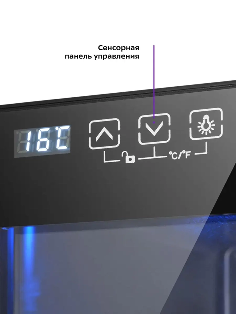 Дверца шкафа прозрачная, в верхней части расположена сенсорная панель управления со светодиодным дисплеем.