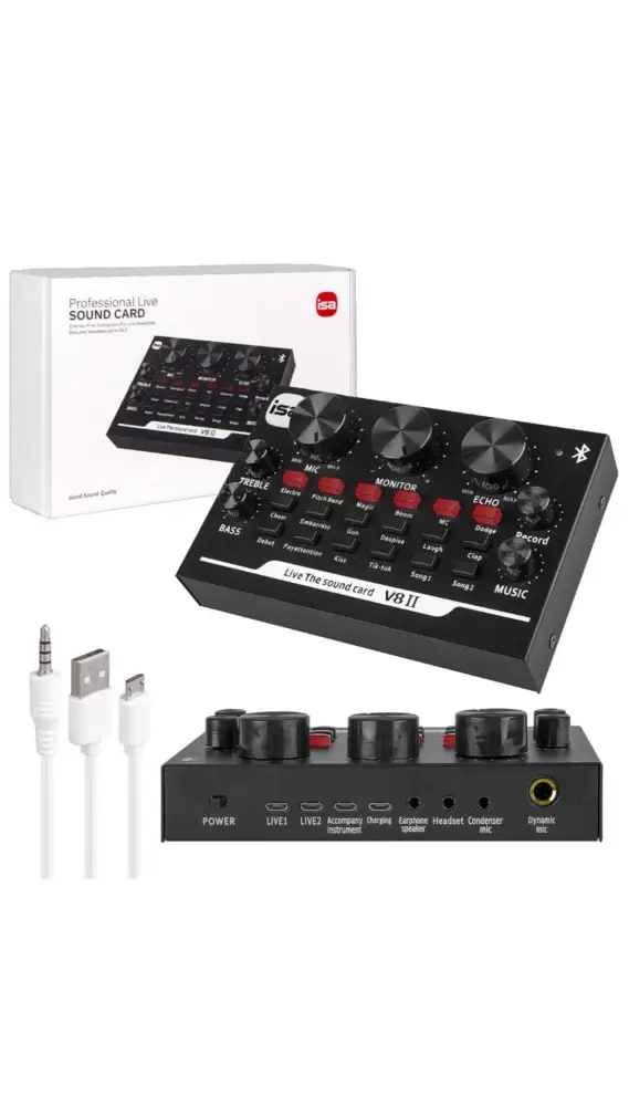 Внешняя звуковая карта V8-2 ISA — это компактное и функциональное устройство для улучшения качества звука при записи и трансляциях. Она подходит для стримов, караоке, игры на музыкальных инструментах с одновременной записью вокала и других развлекательных мероприятий. Эта звуковая карта отличается удобством использования благодаря беспроводному подключению и встроенному аккумулятору, а также широкими возможностями регулировки звука и эффектов, что делает её универсальным решением для записи и обработки аудио.