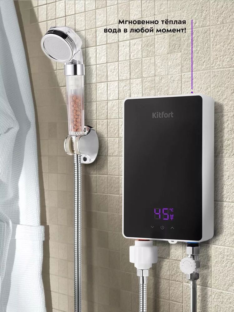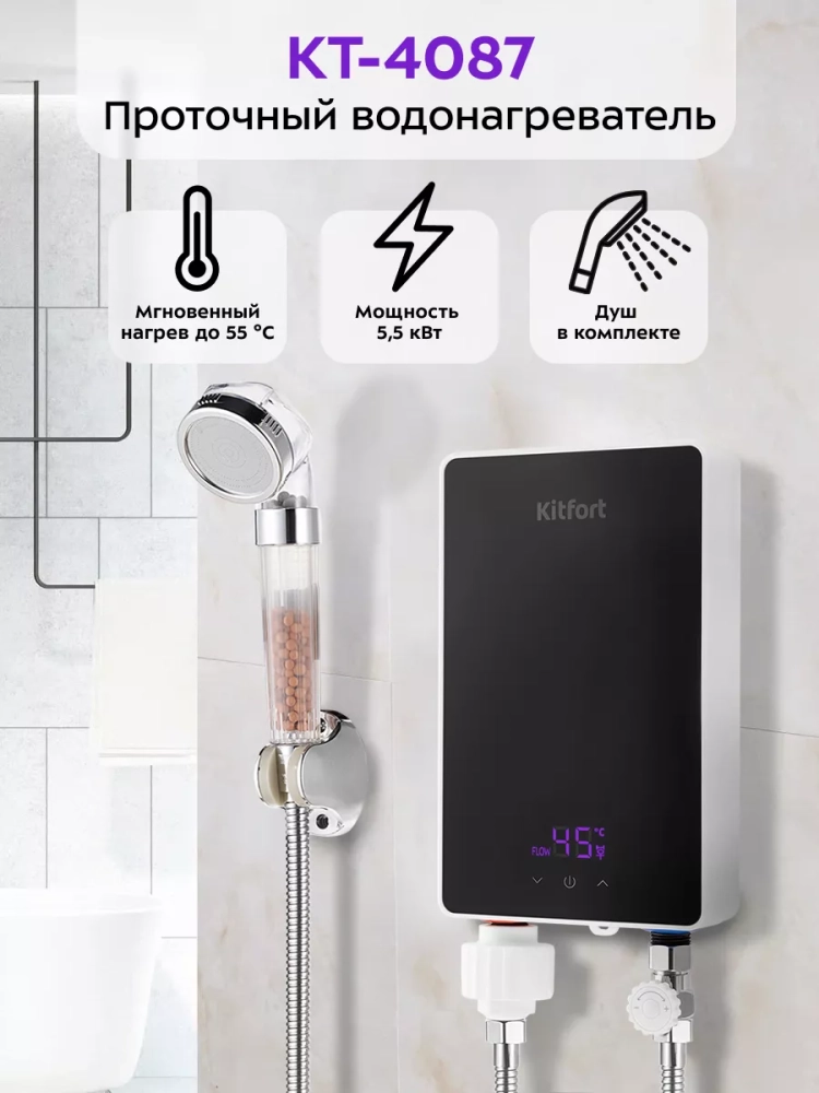 Проточный водонагреватель Kitfort КТ-4087 предназначен для нагрева холодной проточной воды.
