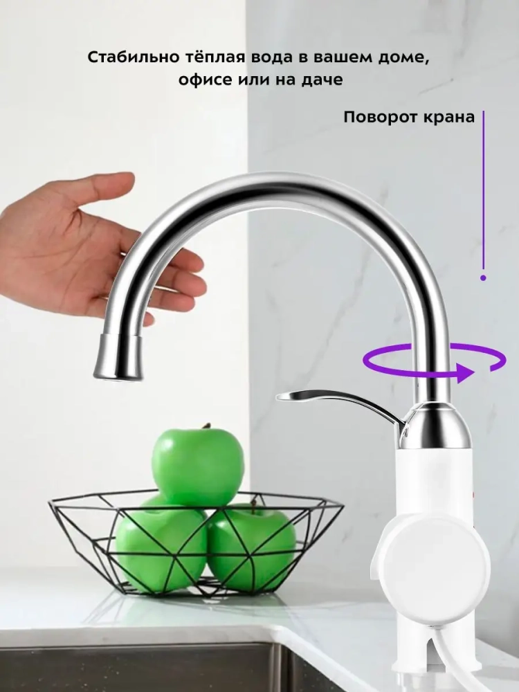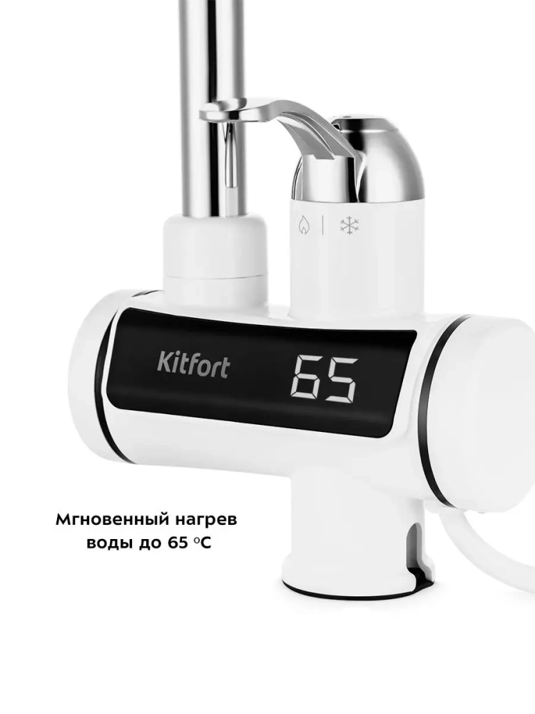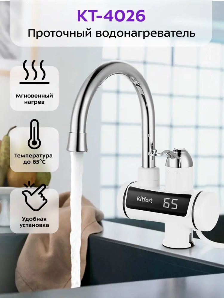 Проточный водонагреватель Kitfort КТ-4026 выполнен в виде смесителя и предназначен для быстрого нагрева холодной проточной воды. Водонагреватель отличается простотой и легкостью монтажа: достаточно просто закрепить его на месте смесителя и подвести к нему холодную воду.