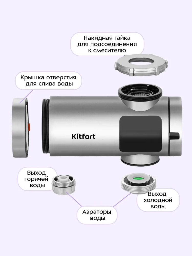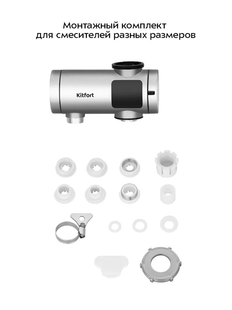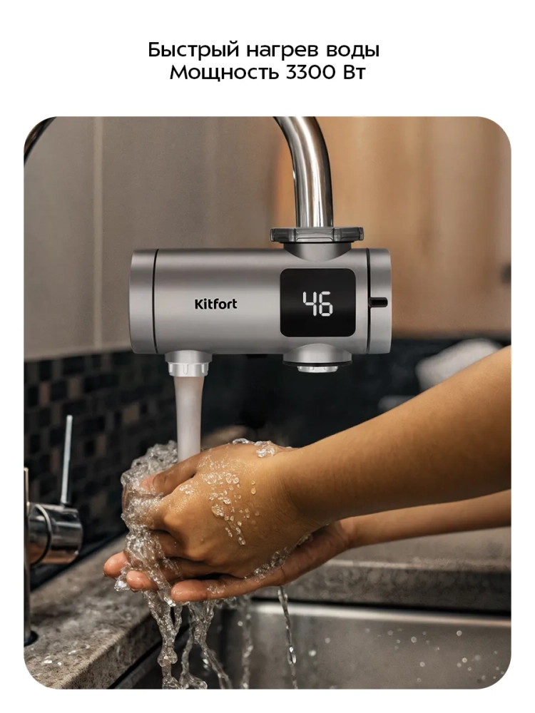 Проточный водонагреватель Kitfort KT-6522 предназначен для быстрого нагрева холодной проточной воды. Водонагреватель отличается простотой и легкостью монтажа: закрепите устройство на вашем смесителе вместо аэратора. В комплекте поставляются муфты для смесителей разного диаметра.