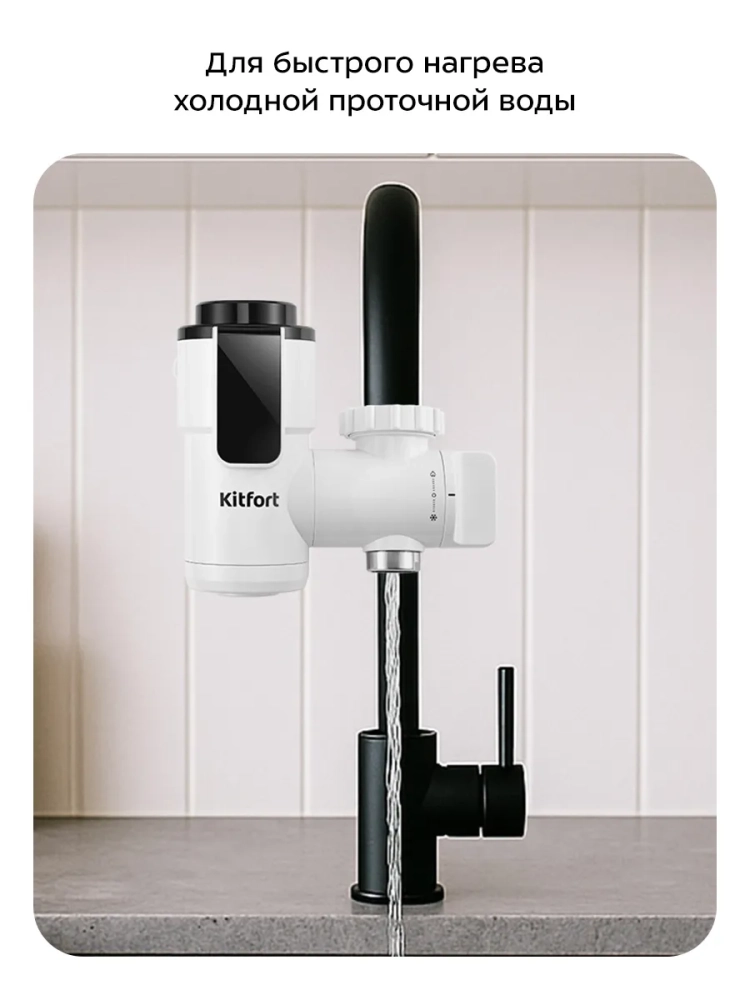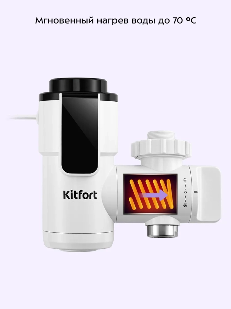 Проточный водонагреватель Kitfort KT-6525 предназначен для быстрого нагрева холодной проточной воды. Водонагреватель отличается простотой и легкостью монтажа: закрепите устройство на вашем смесителе вместо аэратора. В комплекте поставляются муфты для смесителей разного диаметра.