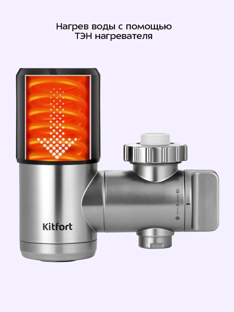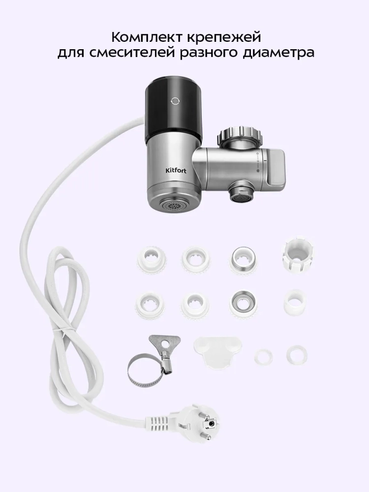 Проточный водонагреватель Kitfort KT-6526 предназначен для быстрого нагрева холодной проточной воды. Водонагреватель отличается простотой и легкостью монтажа: закрепите устройство на вашем смесителе вместо аэратора. В комплекте поставляются муфты для смесителей разного диаметра.