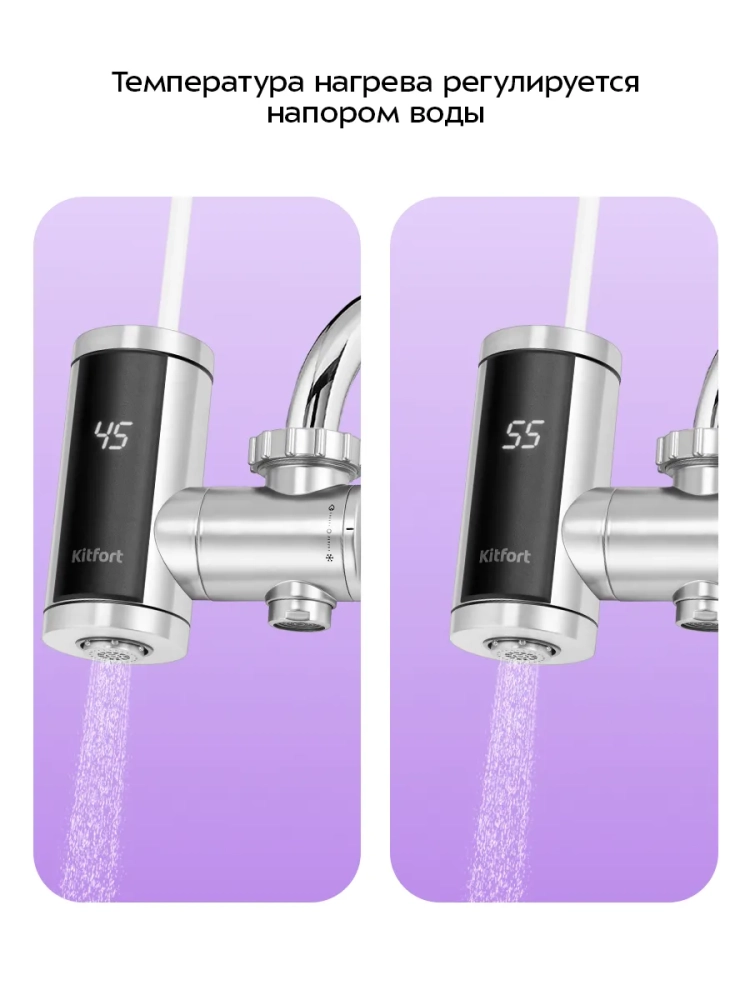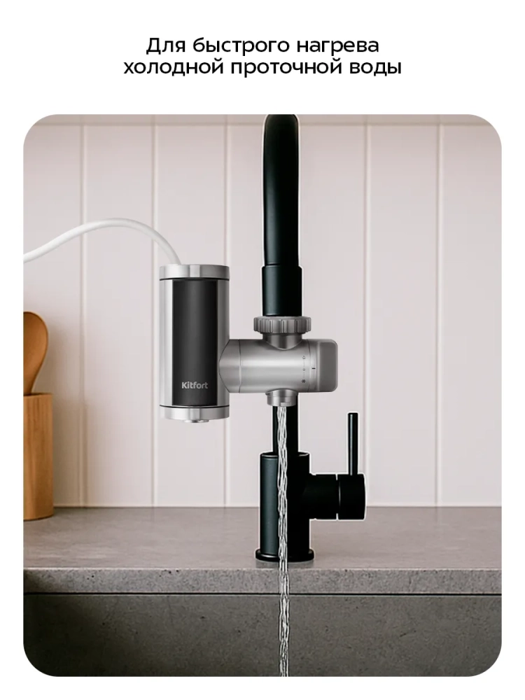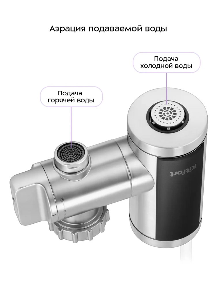 Проточный водонагреватель Kitfort KT-6528 предназначен для быстрого нагрева холодной проточной воды. Водонагреватель отличается простотой и легкостью монтажа: закрепите устройство на вашем смесителе вместо аэратора. В комплекте поставляются муфты для смесителей разного диаметра.