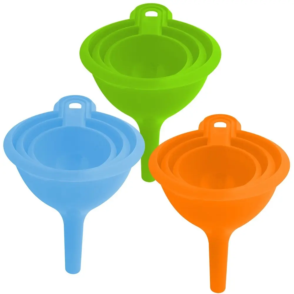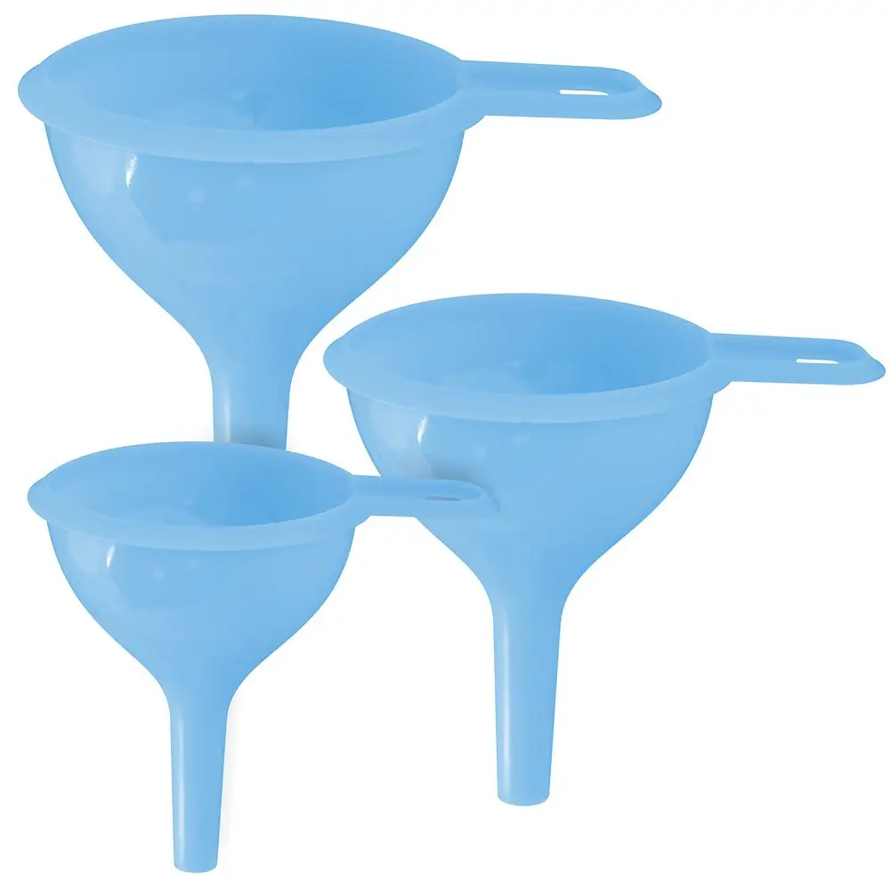 Набор воронок позволяет подобрать нужный размер для конкретной посуды – для емкостей с узким или широким горлышком, для переливания больших и маленьких объемов жидкостей.