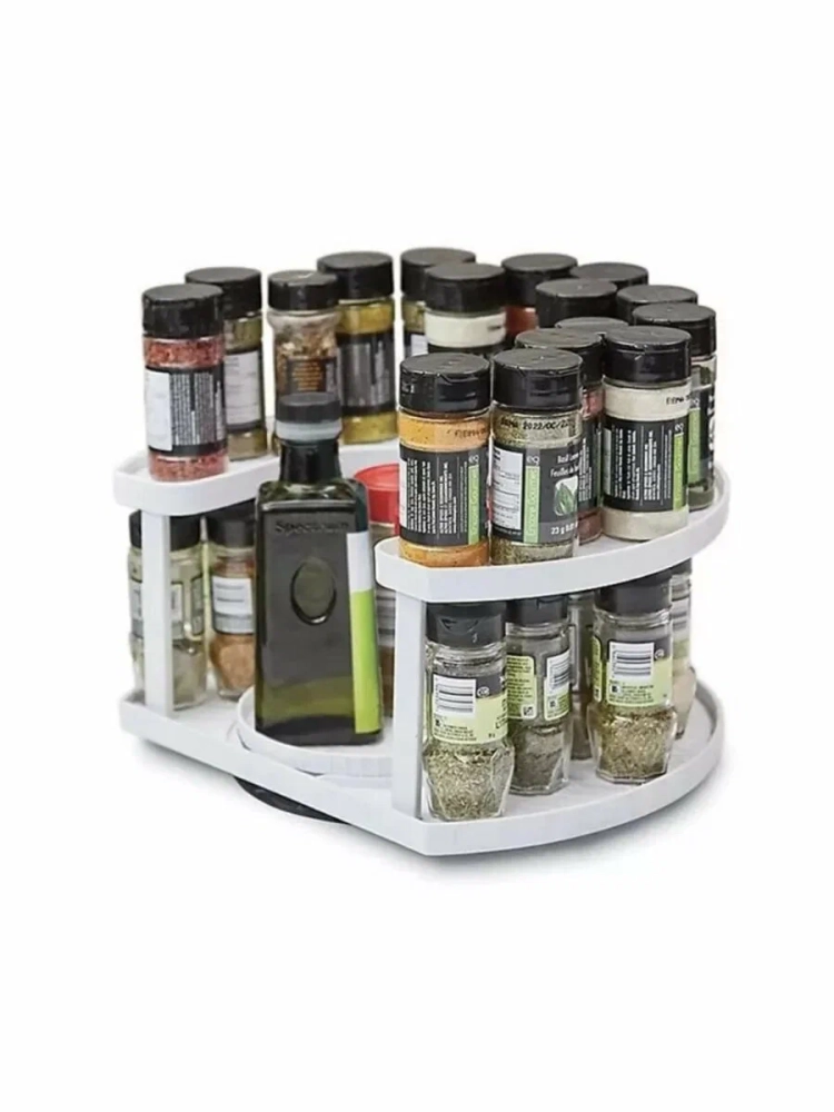 Вращающаяся подставка для хранения специй и приправ впишется в любой интереьер и поможет организовать пространство более рационально на кухне, балконе, кладовой и ванной комнате. Плюсы подставки: вращение на 360 градусов, прочный материал, два яруса. Вмещает банки под специи и бутылки в 2 ряда. Полку-подставку можно использовать в шкафу для компактного хранения приправы, специй, пряностей, посуды для соуса, кофе, чая, витаминов и лекарств, на столе, и даже в холодильнике для охлаждения напитков, под бутылки. Отлично подойдет для подачи закусок, размещения мелочей для кухни, хранения овощей и фруктов. Крутящийся органайзер очень удобен в использовании, так как может вращаться на 360 градусов, что обеспечивает легкий доступ к кухонной утвари.