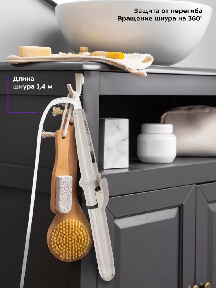 Шнур оснащен защитой от перегиба, что увеличивает срок службы прибора. На защите от перегиба находится петля, за которую удобно повесить устройство при хранении. Вращение шнура на 360° обеспечивает удобство в использовании выпрямителя для волос — провод не сматывается и не путается при повороте устройства, а поворачивается вместе с ним.