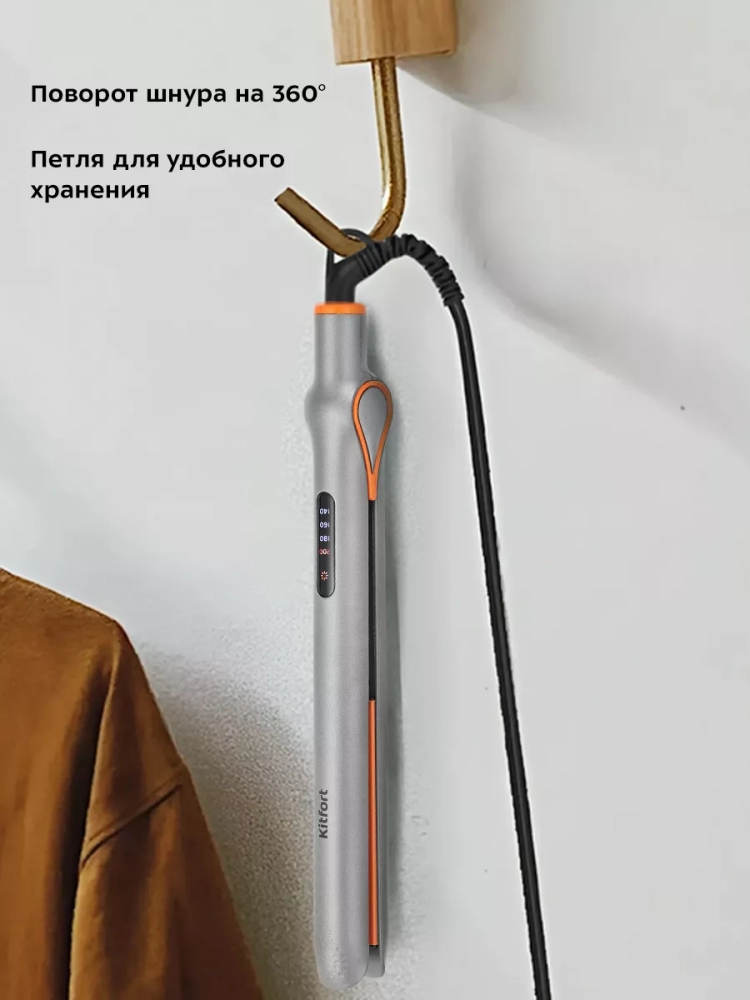 Шнур оснащен защитой от перегиба, что увеличивает срок службы прибора. На защите от перегиба находится петля, за которую удобно повесить устройство при хранении. Вращение шнура на 360° обеспечивает удобство в использовании выпрямителя для волос — провод не сматывается и не путается при повороте устройства, а поворачивается вместе с ним.