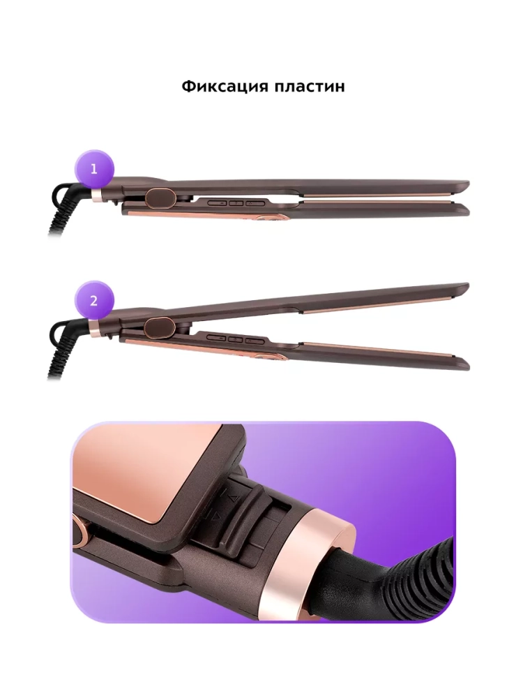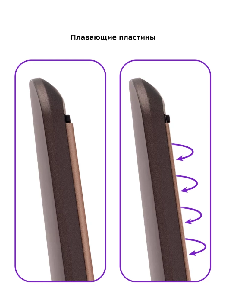 Пластины прибора являются плавающими — когда давление на пластины слишком большое, пластина уходит вглубь корпуса, тем самым защищая волосы от повреждения. Также плавающие пластины «подстраиваются» под толщину пряди, и прибор прогревает всю прядь равномерно.
