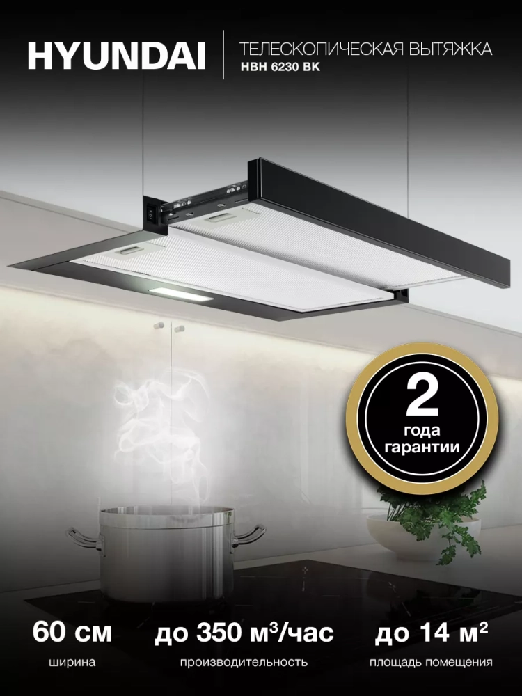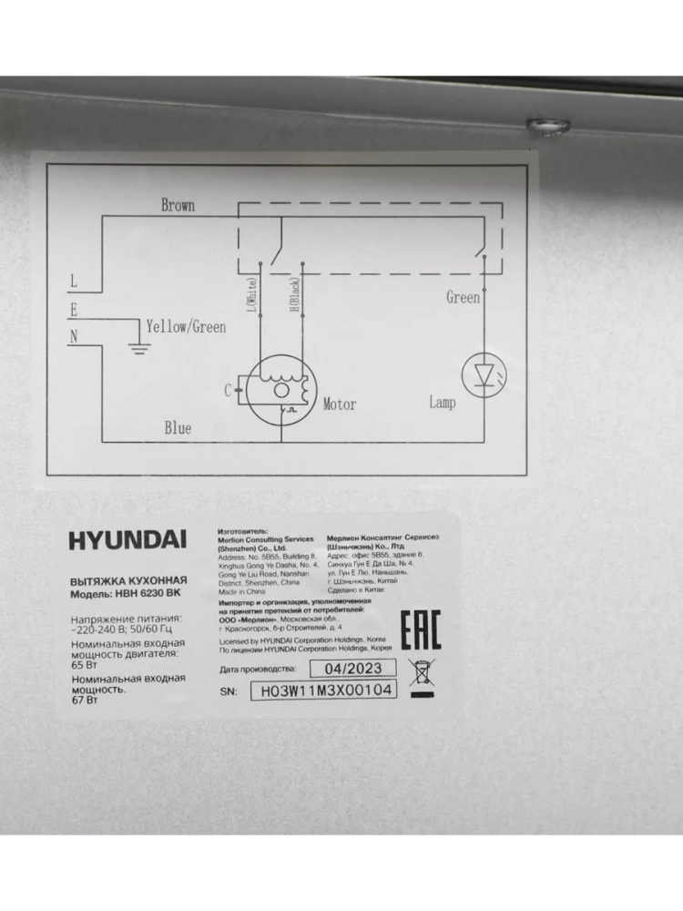Встраиваемая вытяжка Hyundai HBH 6230 BK черный, количество двигателей: 1, режим работы: отвод/циркуляция, кулисные переключатели управление, алюминиевый жироулавливающий фильтр
