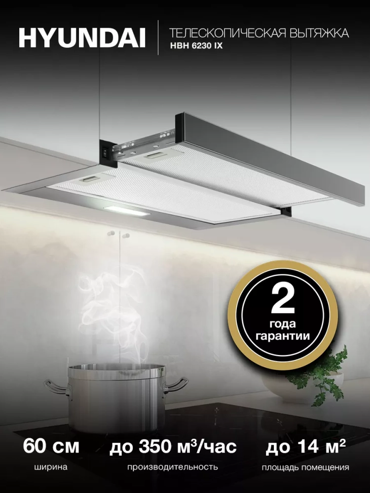 Встраиваемая вытяжка Hyundai HBH 6230 IX нержавеющая сталь, количество двигателей: 1, режим работы: отвод/циркуляция, кулисные переключатели управление, алюминиевый жироулавливающий фильтр