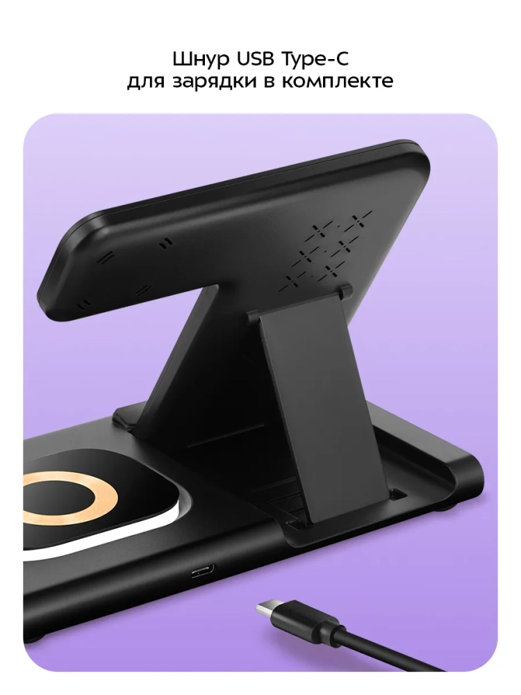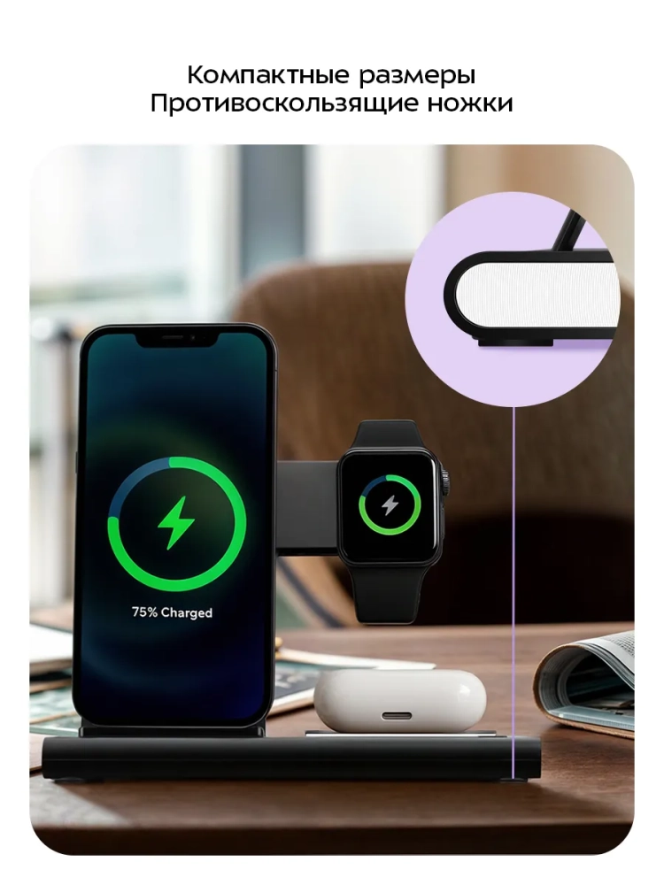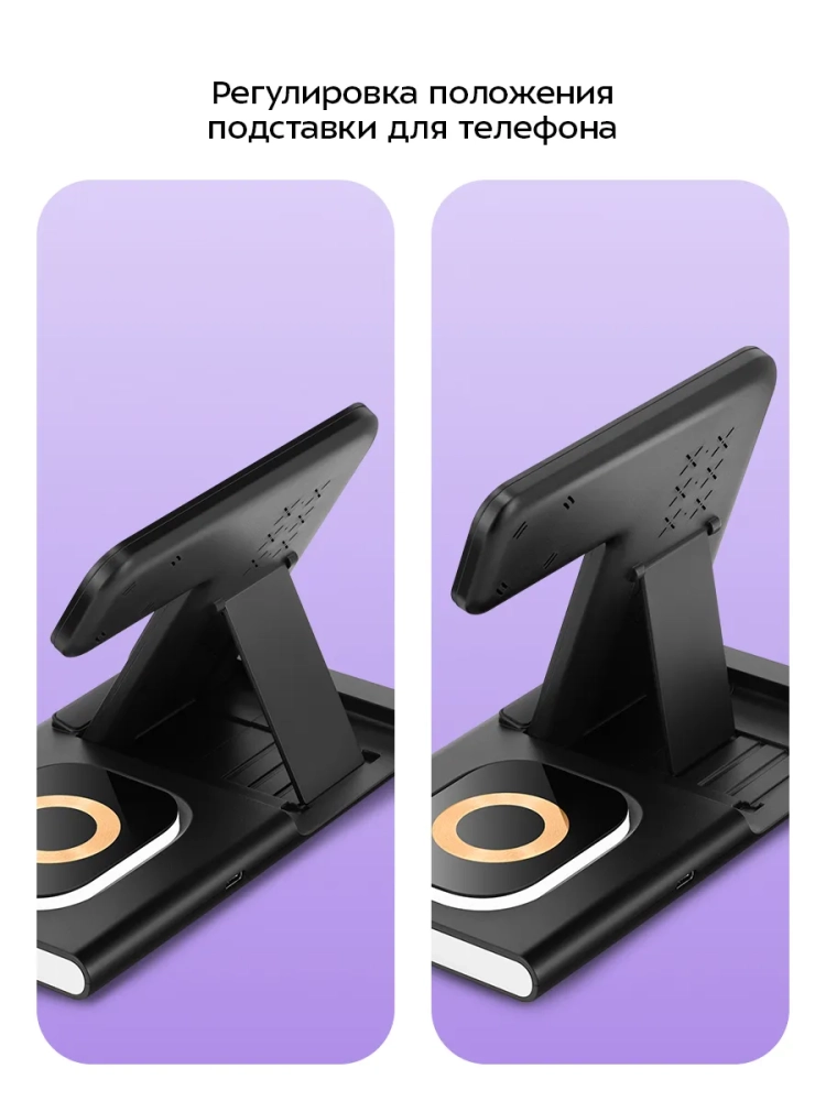 Зарядная станция KT-3753 позволяет заряжать 3 устройства одновременно. Подставка для телефона предназначена для зарядки смартфонов, подставка для часов — для зарядки Apple Watch (Series 3, 4, 5, 6, 7, 8, 9, SE, Ultra, Ultra 2), а область беспроводной зарядки наушников позволяет заряжать наушники и любые другие устройства, поддерживающие беспроводную зарядку Qi. Положение подставки для телефона регулируется. Вы можете расположить телефон на подставке вертикально или горизонтально. В вертикальном положении вы можете продолжать пользоваться приложениями с вертикальной ориентацией, пока ваш телефон заряжается. В горизонтальном положении удобно смотреть видео.