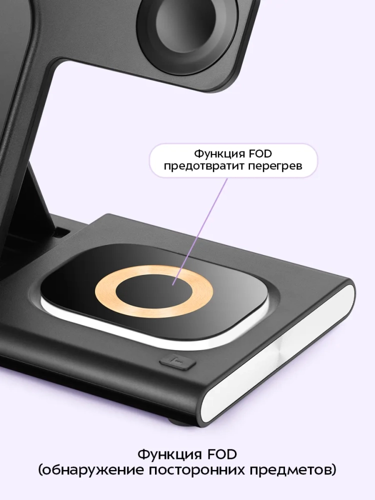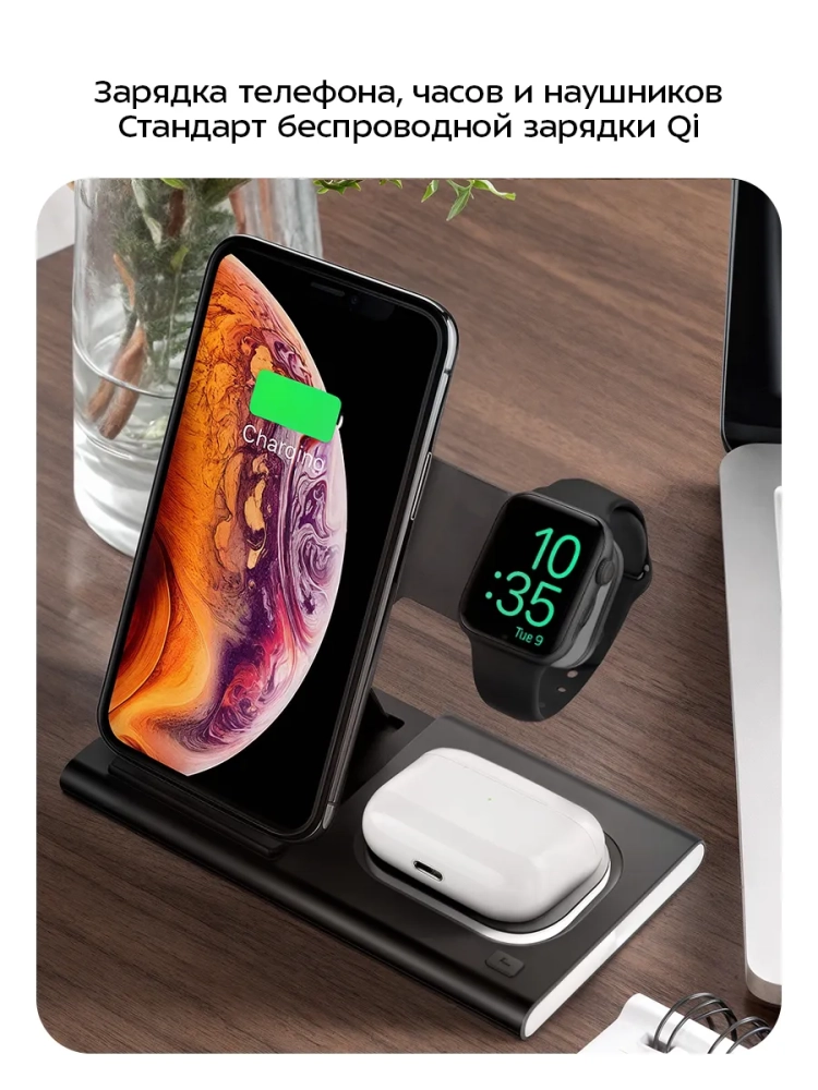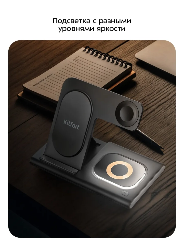 Зарядная станция Kitfort КТ-3753 позволяет с легкостью заряжать телефон, часы и наушники или другие устройства, если они поддерживают функцию беспроводной зарядки. Устройство работает по стандарту Qi для индукционной передачи энергии. Многие современные смартфоны и умные часы поддерживают стандарт беспроводной зарядки Qi.