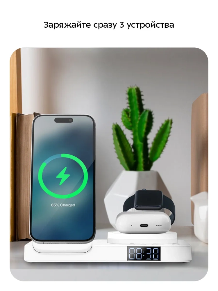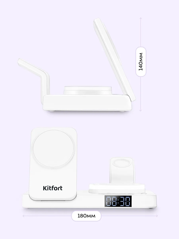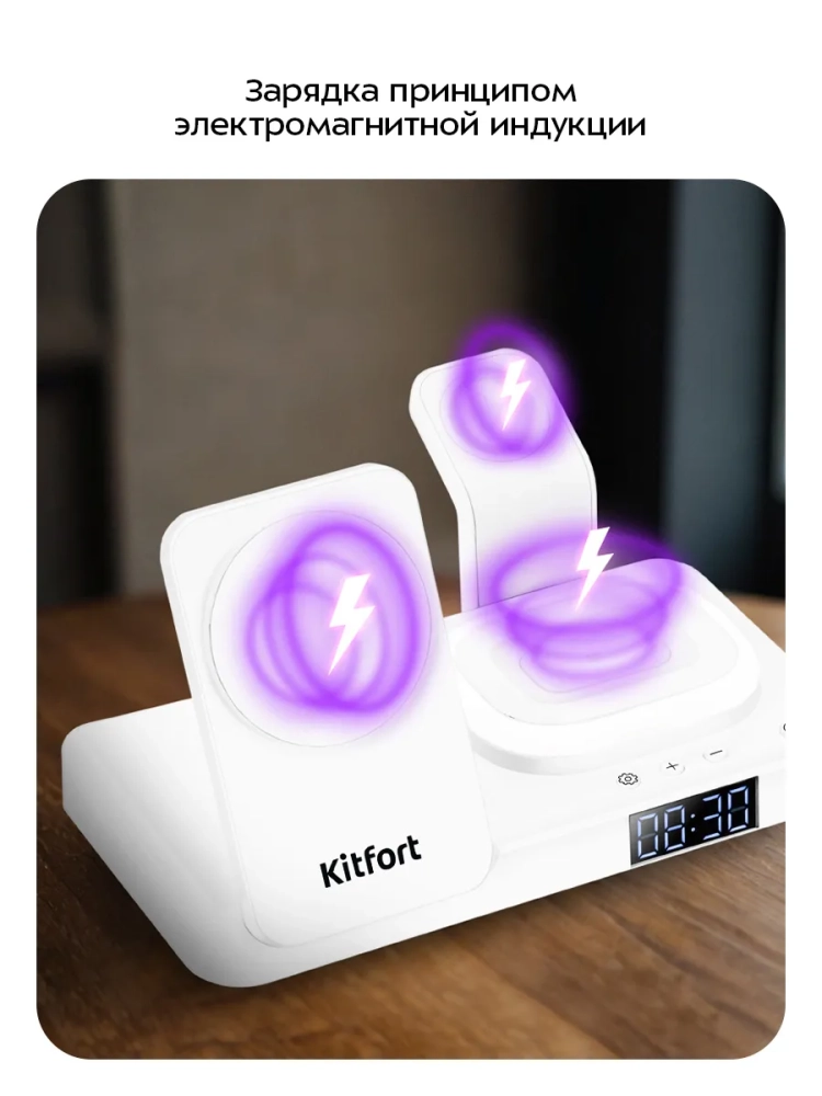 Зарядная станция Kitfort КТ-3760 позволяет с легкостью заряжать телефон, часы и наушники или другие устройства, если они поддерживают функцию беспроводной зарядки. Устройство работает по стандарту Qi для индукционной передачи энергии. Многие современные смартфоны и умные часы поддерживают стандарт беспроводной зарядки Qi.