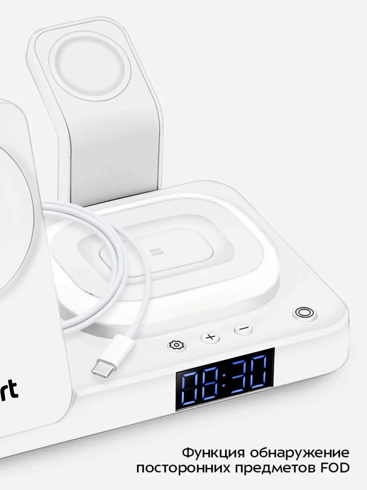 На дисплее зарядной станции отображается текущее время, поэтому вы можете использовать зарядную станцию как настольные часы. Вокруг области беспроводной зарядки наушников предусмотрена подсветка.