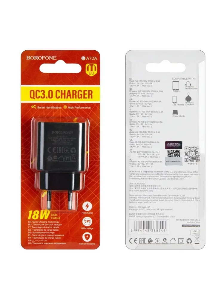 BOROFONE BA72A Spring, сетевое зарядное устройство с выходом USB 18W, вилка EU, поддержка протоколов быстрой зарядки.