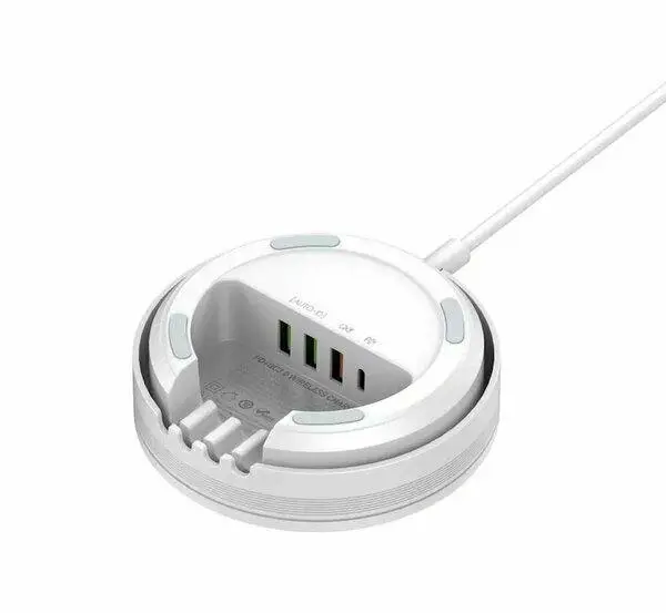 Универсальное сетевое зарядное устройство, сочетающее в себе проводную и беспроводную зарядку. Модуль беспроводной зарядки имеет максимальную мощность 32W. Для подключения к сети используется встроенный кабель с европейской вилкой. LDNIO AW003 имеет всестороннюю защиту, включая негорючий корпус (до 750°С), защиту от перенапряжения, короткого замыкания и превышения по току, а также от перегрева. Рекомендуется использовать как в качестве основного зарядного устройства. Многофункциональный адаптер – это удобное и простое устройство. Идеально подходит для зарядки мобильных устройств, камер, фотоаппаратов и т. д. Разъемы USB позволяют питать одновременно три устройства. Наличие ночной подсветки станет приятным дополнением, активирующимся при нажатии на значок "лампочка". Корпус изделия позволяет установить съемную подставку для мобильного телефона или камер.