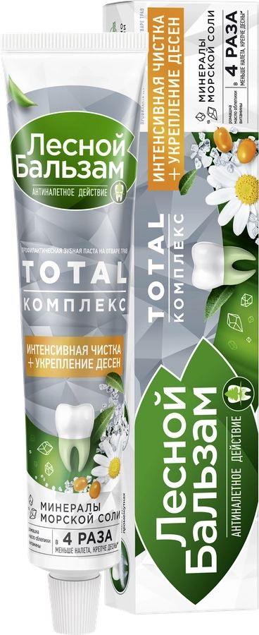 Зубная паста на отваре трав с экстрактом ромашки и маслом облепихи профилактическая ЛЕСНОЙ БАЛЬЗАМ сочетает в себе сразу 3 действия, обеспечивая максимальную защиту всей полости рта: укрепляет десны, защищает от кариеса и сохраняет свежесть дыхания в течение дня.