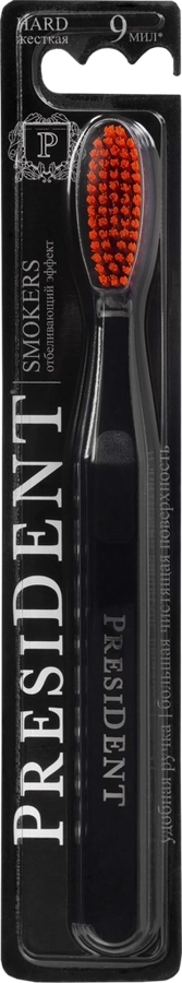 Жесткая зубная щетка PRESIDENT Smokers 9 МИЛ* с отбеливающим эффектом для тех, кто курит, любит кофе, чай и вино, подходит для качественного интенсивного очищения. Большая головка обеспечивает быстрое очищение внешних, внутренних и жевательных участков зубного ряда. Оптимально закругленные кончики щетины проходят трехуровневую обработку, деликатно полируют зубную эмаль и не травмируют десны. Удобная, эргономичная ручка позволяет соблюдать правильную технику чистки зубов. *МИЛ – показатель соотношения диаметра щетины и жесткости зубной щетки. Чем больше диаметр щетины, тем больше жесткость зубной щетки. Рекомендованное время чистки зубов: 2–3 минуты. Рекомендации по уходу за зубной щеткой: после применения промыть зубную щетку водой. Хранить в вертикальном положении, рабочей частью вверх. Стоматологи рекомендуют менять щетку раз в два месяца и каждый раз после перенесенных инфекций полости рта и дыхательных путей.